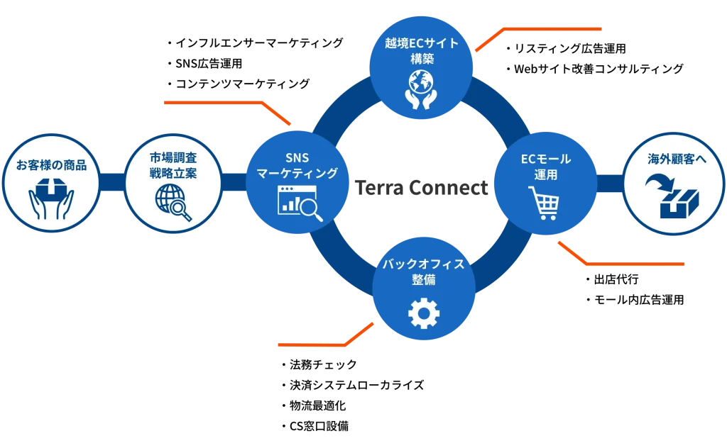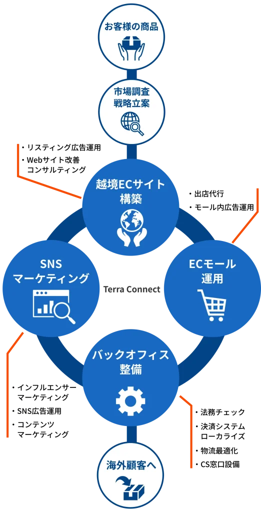 コンバージョン率最適化、そして継続的なパフォーマンス監視と改善提案を行い、御社の越境EC事業の成功と成長を支援します。