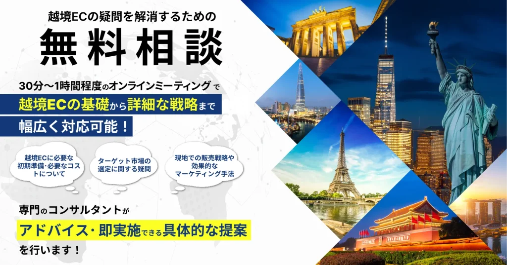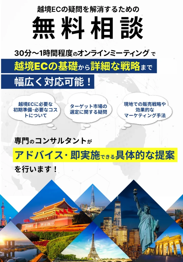 30分〜1時間程度の オンラインミーティングで、越境ECの基礎から詳細な戦略まで幅広く対応可能です。